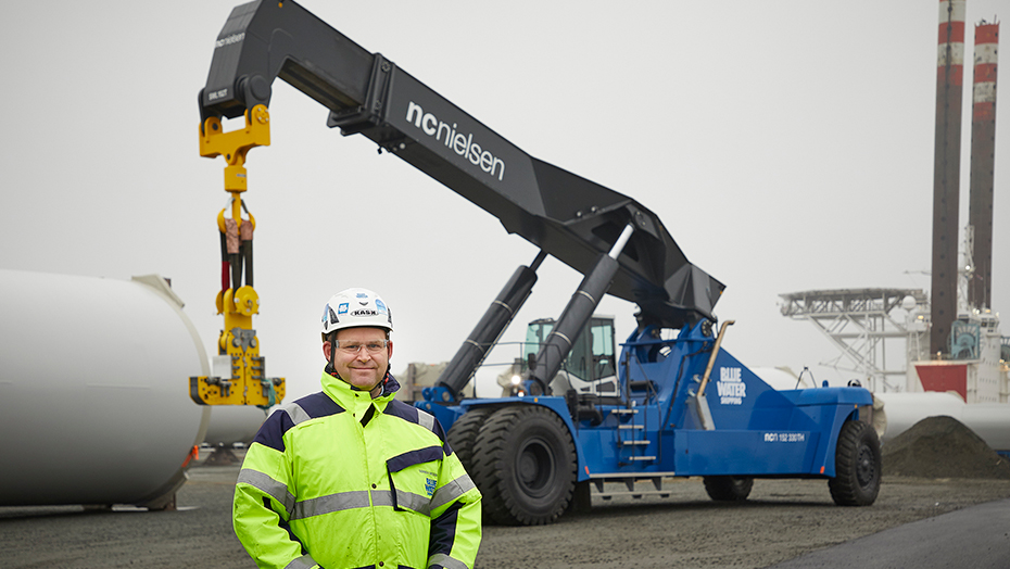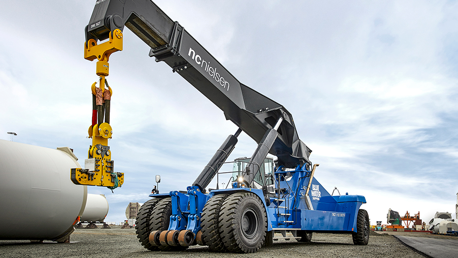 For Blue Water Shipping opfylder verdens største reachstacker et længe næret ønske om fleksible løft i den helt tunge ende af skalaen. Som et alternativ til kraner skal reachstackeren hjælpe til med de store løft af vindmølletårne, naceller, rammer og konstruktioner i et tæt samspil med de øvrige heavy duty-maskiner: